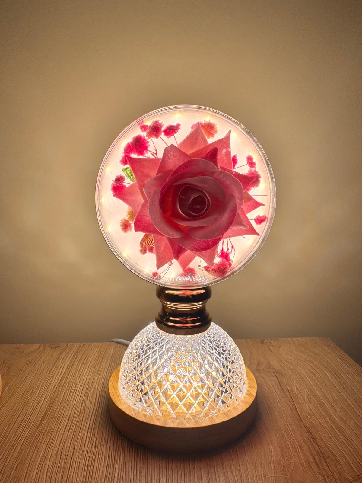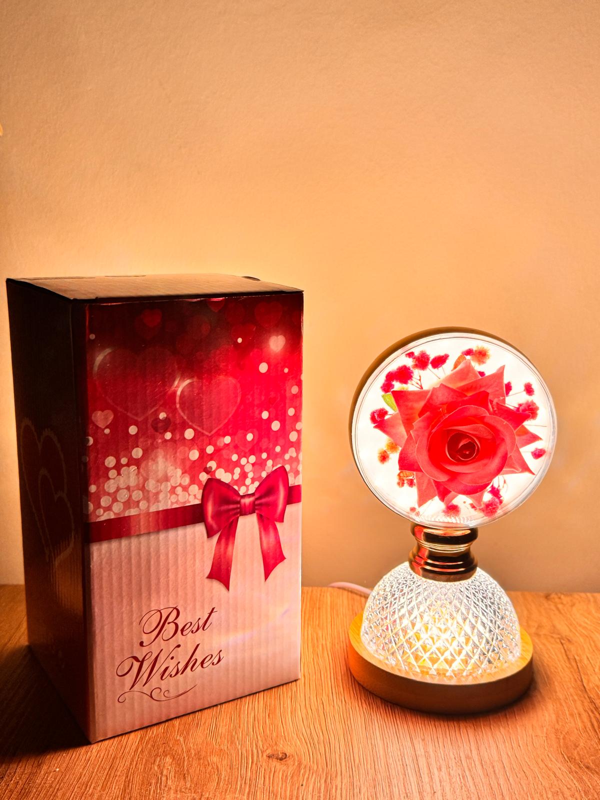 Romantizmi ve zarafeti bir araya getiren bu dekoratif ışıklı gül lambası, sevdiklerinize verebileceğiniz en özel hediyelerden biridir. Kristal desenli tabanı ve şeffaf kubbesi içinde yer alan kırmızı yapay gül, LED ışıklarla birleşerek ortama sıcak ve romantik bir atmosfer katar.