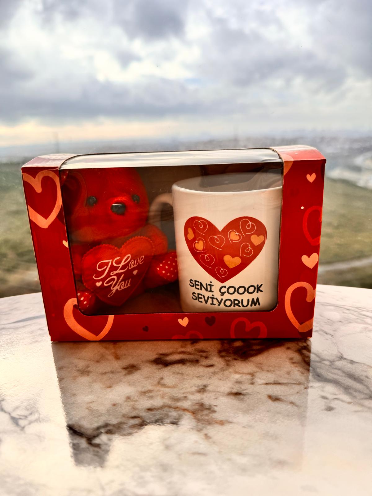 Sevginizi ifade etmenin en tatlı yolu bu romantik hediye seti! Özel tasarımlı kırmızı kutusunda; kalpleriyle süslenmiş peluş ayıcık, üzerinde “I Love You” yazılı kalp yastığı ve “Seni Çooook Seviyorum” mesajlı seramik kupa yer alıyor. Sevgililer Günü, doğum günü, yıl dönümü veya sürpriz yapmak istediğiniz her özel anda sevdiklerinize unutulmaz bir hediye sunabilirsiniz.